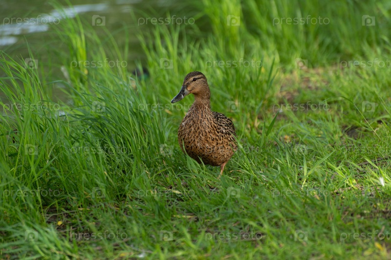 Коричневая утка собирает корм в траве возле пруда и настороженно смотрит в камеру