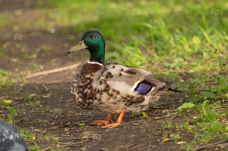 Селезень с зеленой головой собирает еду в траве возле пруда