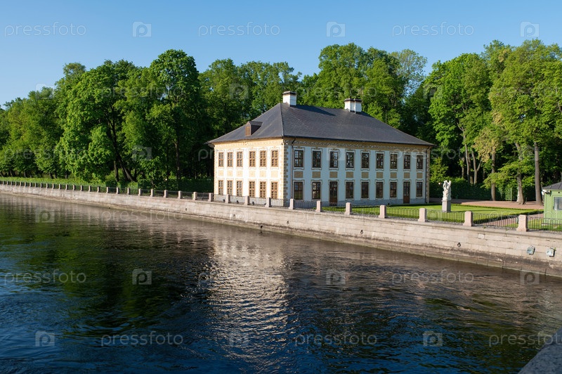 Двухэтажный особняк в летнем саду на берегу реки