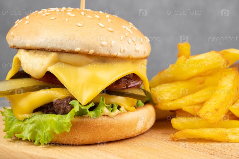 Гамбургер с помидорами, солеными огурцами и сыром. Рядом порция картофеля фри