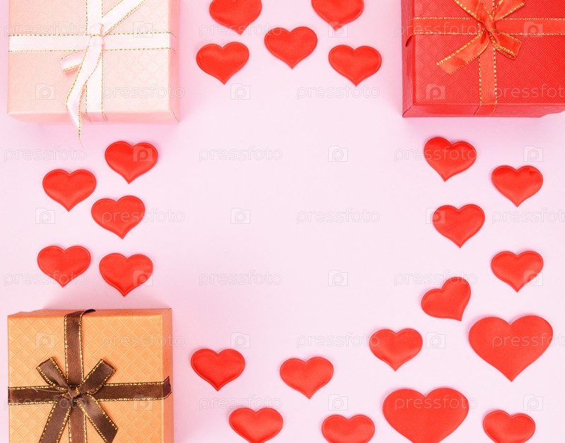 Разноцветные подарочные коробки по углам изображения с декоративными сердечками между ними
