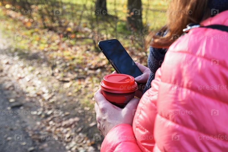Женщина гуляет по осеннему парку, смотрит в экран смартфона и пьет кофе
