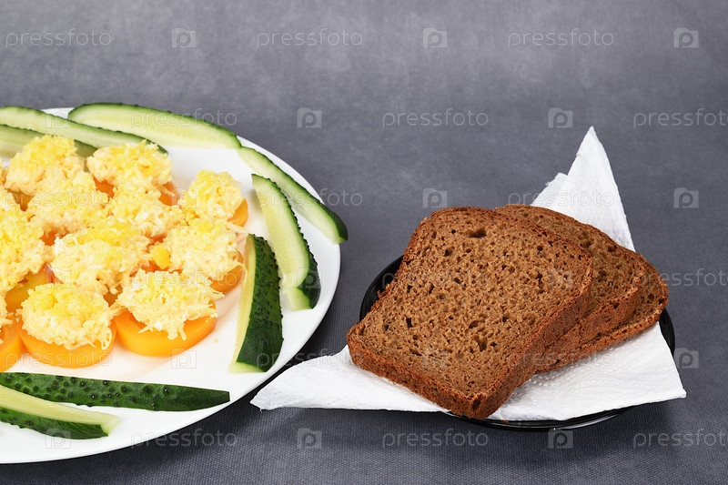 Праздничная закуска на новый год. Сыр с чесноком и свежими огурцами выложен на белой тарелке
