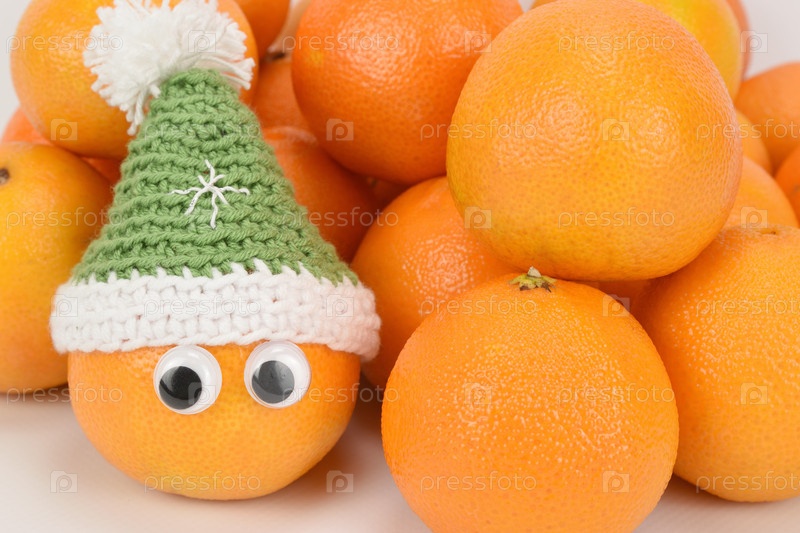 Спелые мандарины, сложенные в кучку и один мандарин с глазками и в зеленой вязаной шапочке