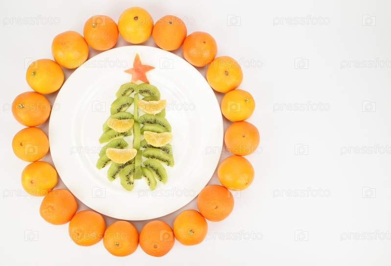 Декоративная новогодняя елка выложена на белой тарелке из киви и мандаринов. Вокруг выложены неочищенные мандарины