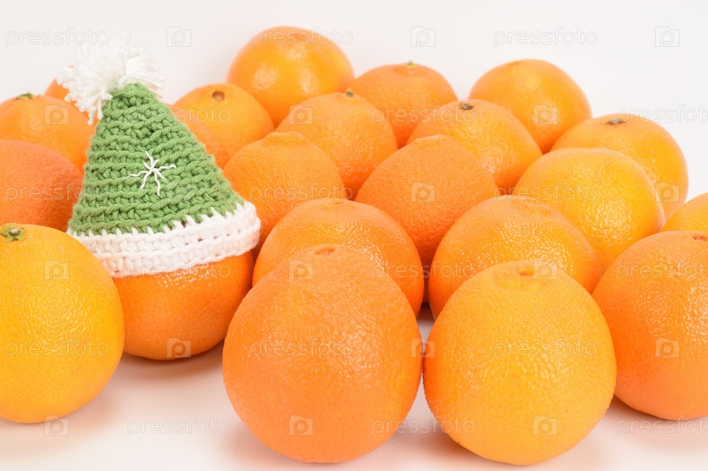 Спелые мандарины разложены на светлом фоне. Один мандарин в зеленом рождественском колпаке