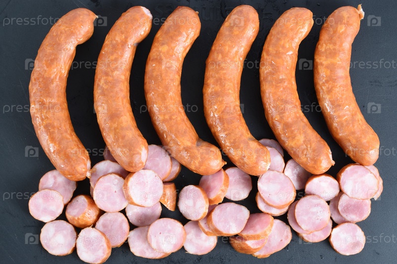 Полукопченые колбасы, выложенные в ряд. Несколько колбасок нарезаются ломтиками и кладутся внизу