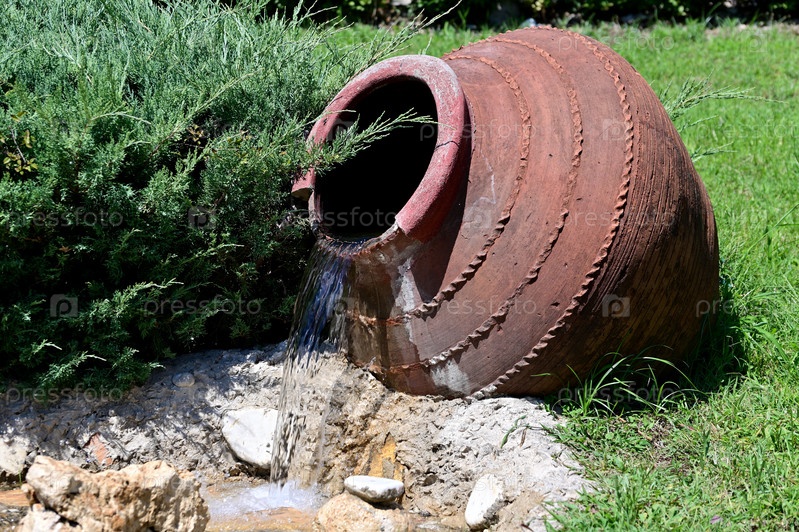 Вода льется из декоративной амфоры в искусственный бассейн
