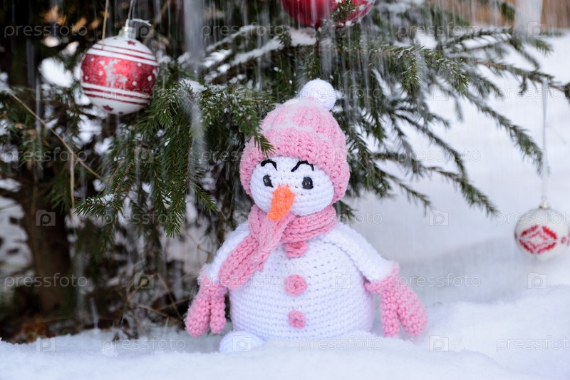 Вязаный игрушечный снеговик стоит под украшенной елкой