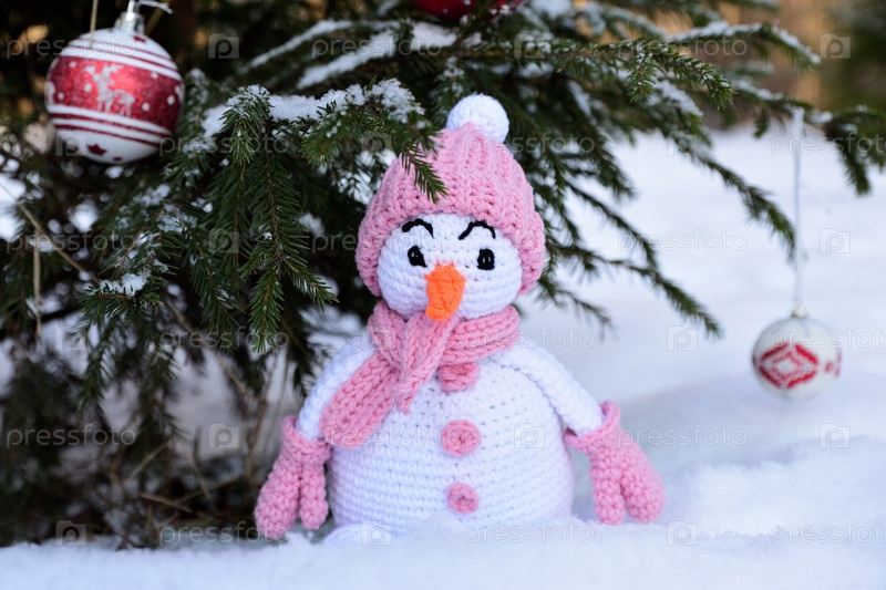 Вязаная снеговик-девочка в розовой одежде стоит на снегу под украшенной елкой