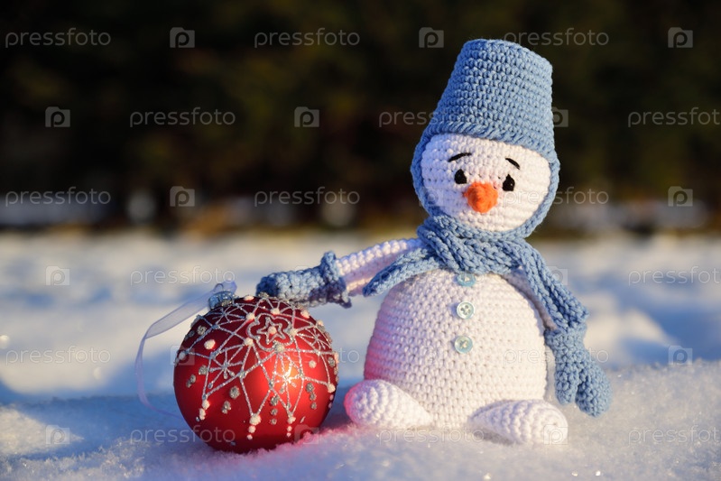 Мальчик-снеговик, связанный из толстой пряжи, стоит на снегу под ярким солнцем. Его рука покоится на елочном шаре