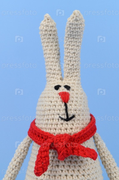 Серый вязаный пасхальный кролик в красном шарфе