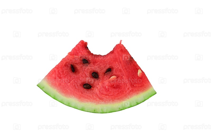 Кусочек красного арбуза в форме треугольника с откушенной верхушкой. На срезе видны черные семена. Изолирован на белом фоне