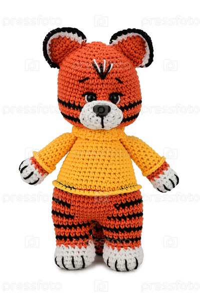 Игрушечный тигр. Мягкая, вязаная игрушка в желтом свитере. Изолирован на белом фоне