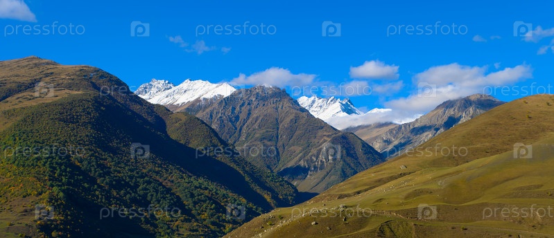 Горный пейзаж с заснеженными вершинами на фоне голубого неба
