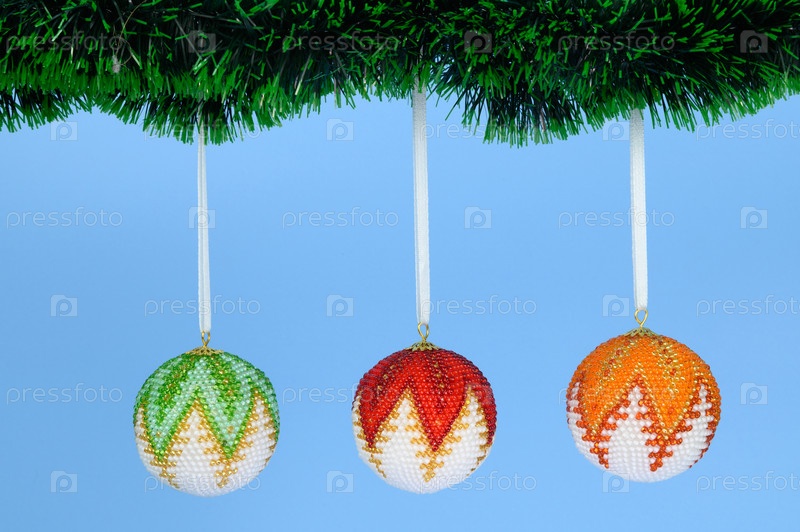 Елочные украшения, висящие на лентах на ветке искусственного дерева