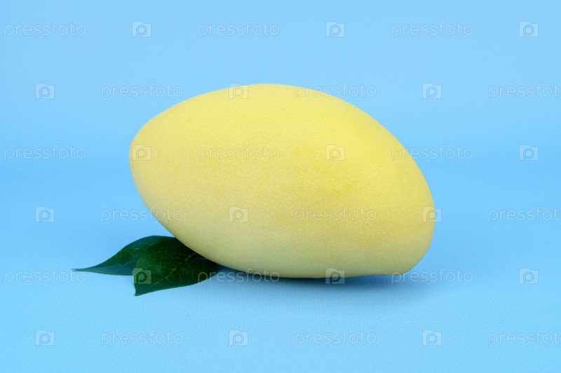 Плод желтого спелого манго с двумя листьями и легкой тенью снизу