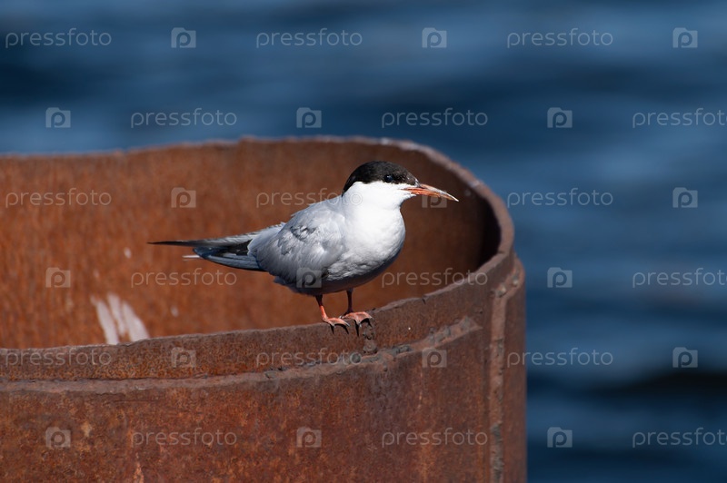 Бело-серая чайка сидит на вертикальной ржавой трубе