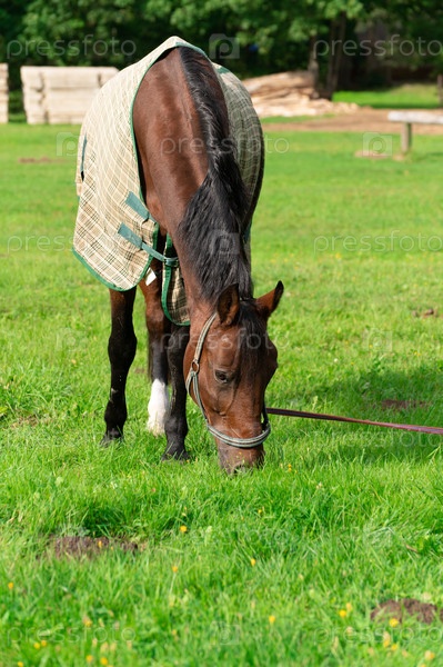Коричневый конь пасется на лугу