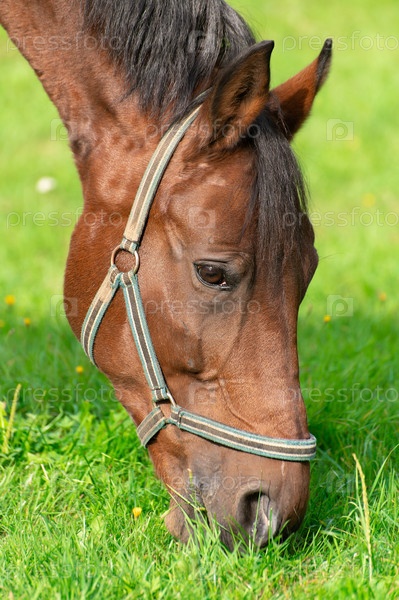 Голова коричневой лошади, пасущейся на зеленом лугу