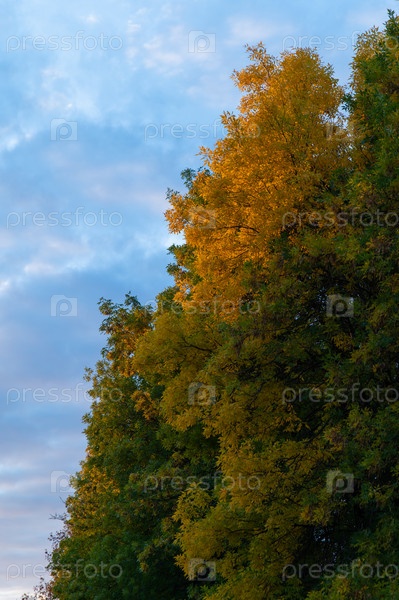 Деревья в городском парке осенью, освещенные солнцем