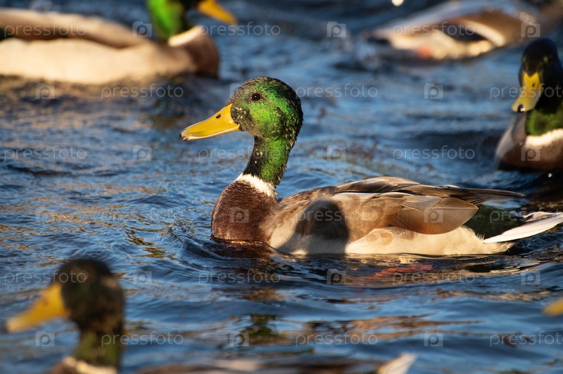 Зеленоголовый селезень, освещенный вечерним солнцем, плавает в городском пруду