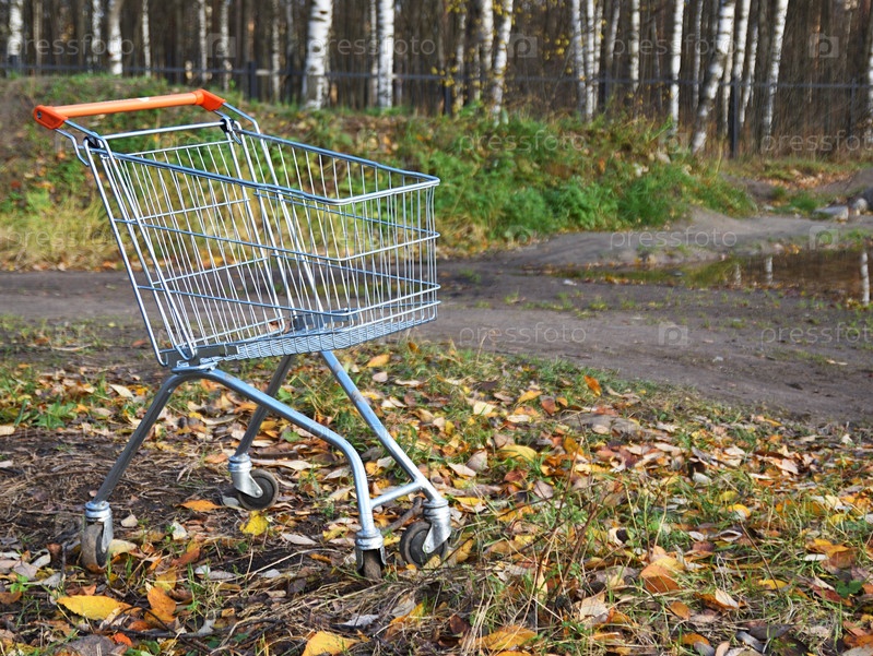Забытая тележка из супермаркета стоит в осеннем парке