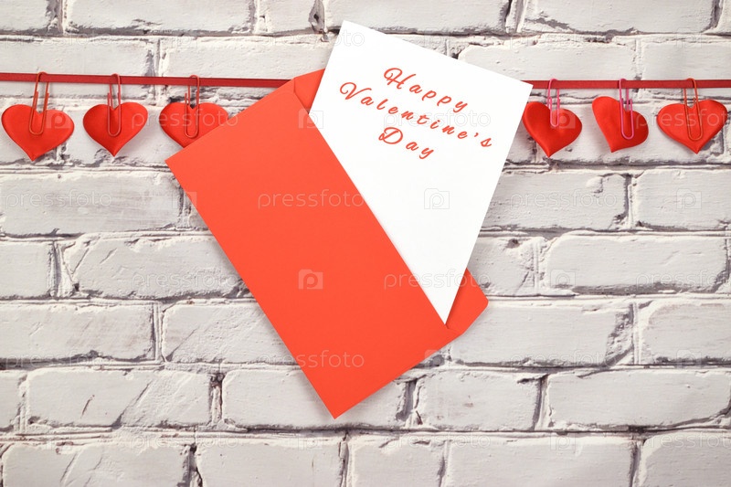 Красные сердечки, висящие на скрепках, и конверт с поздравлениями на фоне белой кирпичной стены