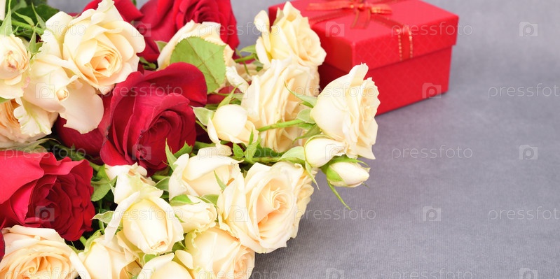 Вид сбоку на лежащий букет красных и белых роз. На заднем плане слегка размытая подарочная коробка