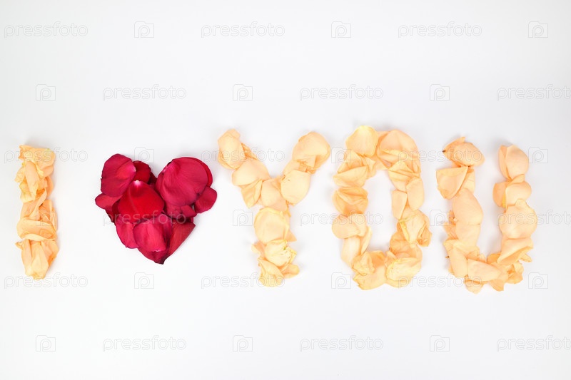 Фраза «Я люблю тебя» выложена на белом фоне из лепестков красных и белых роз