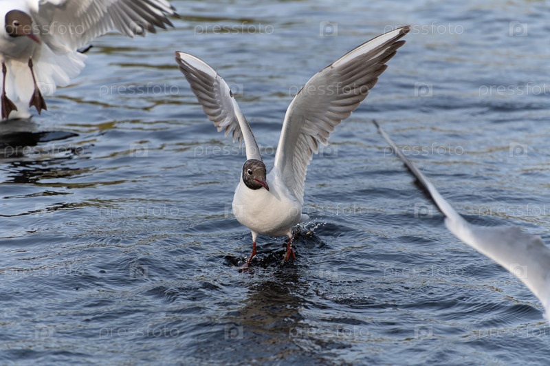 Чайки вырывают друг у друга хлеб в городском пруду