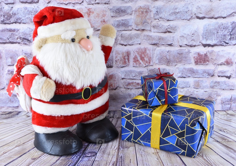 Плюшевый Санта-Клаус стоит рядом с новогодними подарками
