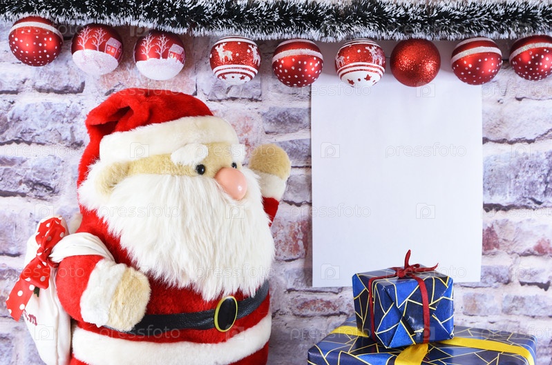 Плюшевый Санта-Клаус стоит рядом с новогодними подарками, а на стене висит чистый лист для поздравлений