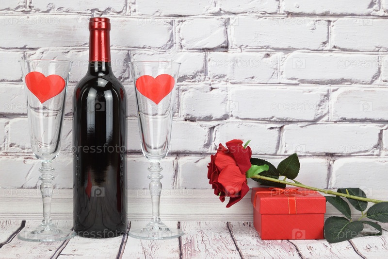 Бутылка красного вина, два бокала с декоративными сердечками внутри и подарочная коробка с красной розой наверху