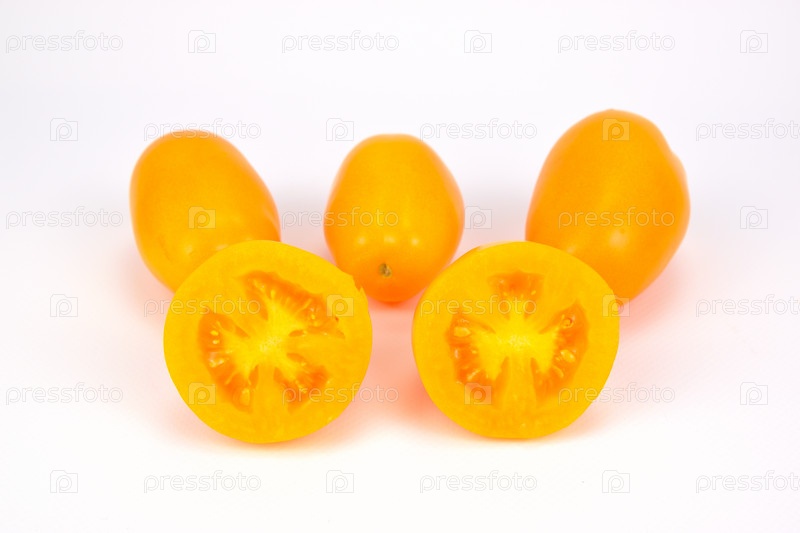 Желтые помидоры, целые и разрезанные пополам, изолированные на белом фоне