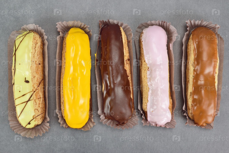Пять разноцветных эклеров, выложенных в полный рост на сером фоне