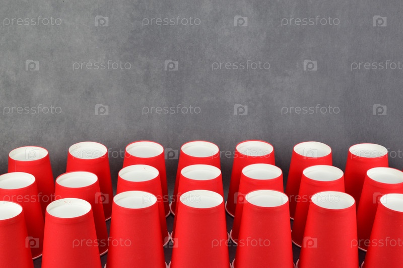 Красные бумажные стаканчики, расставленные в три ряда на горизонтальной поверхности