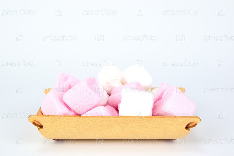 Белые и розовые зефирки в форме сердечек, разложенные на деревянном подносе