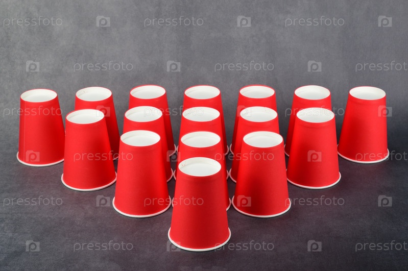 Красные бумажные стаканчики выстроены в ряд в виде стрелки на горизонтальной поверхности