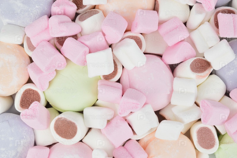Вид сверху на различные виды зефира, разложенные в беспорядке на поверхности стола