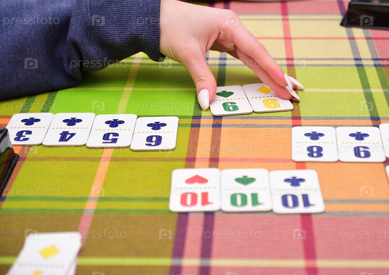 Женская рука раскладывает игральные карты на столе, делая ход