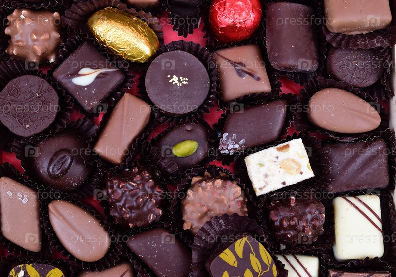Ассорти из шоколадных конфет, разложенных на красной гофрированной бумаге