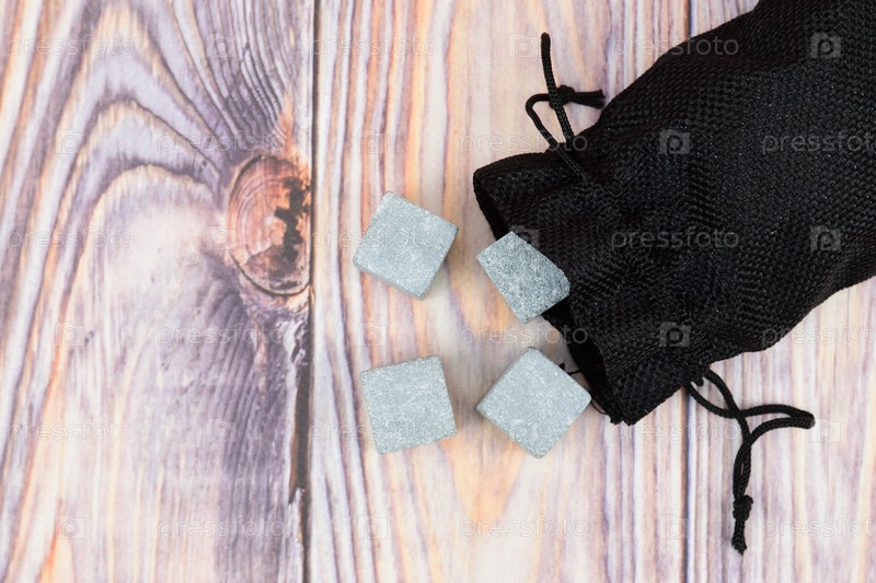 Каменные кубики для охлаждения напитков, насыпанные из черного холщового мешка