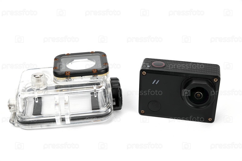 Экшн-камера рядом с прозрачной водонепроницаемой коробкой, изолированной на белом фоне