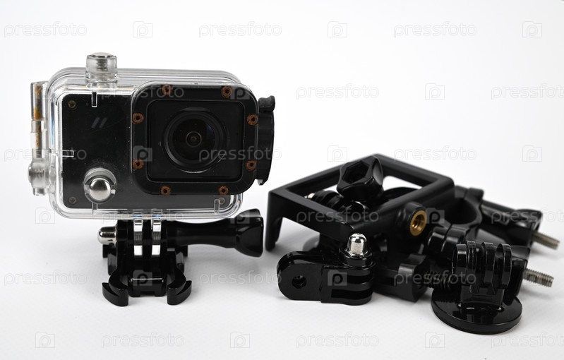 Экшн-камера в прозрачном водонепроницаемом боксе на подставке рядом с кучей аксессуаров