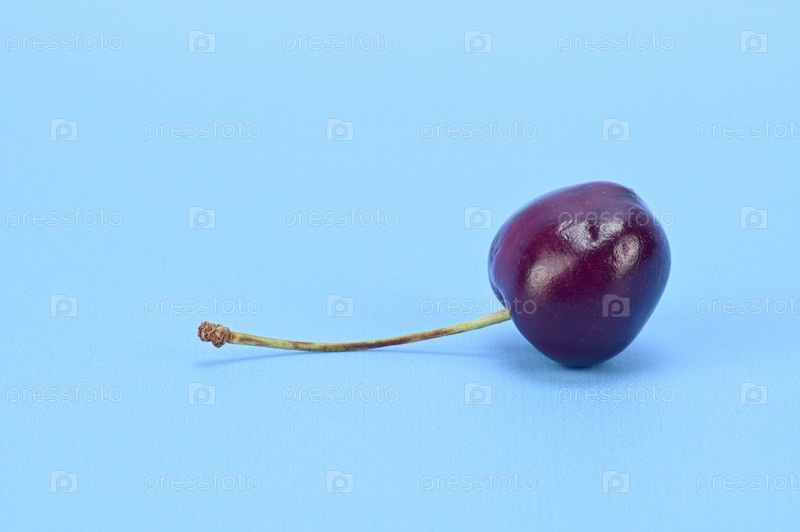 Ягода спелой бордовой вишни, лежащая на боку с ручкой в сторону
