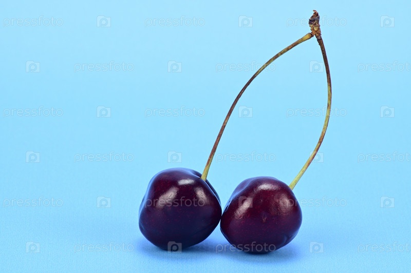 Две ягоды спелой бордовой вишни, соединенные одной ручкой