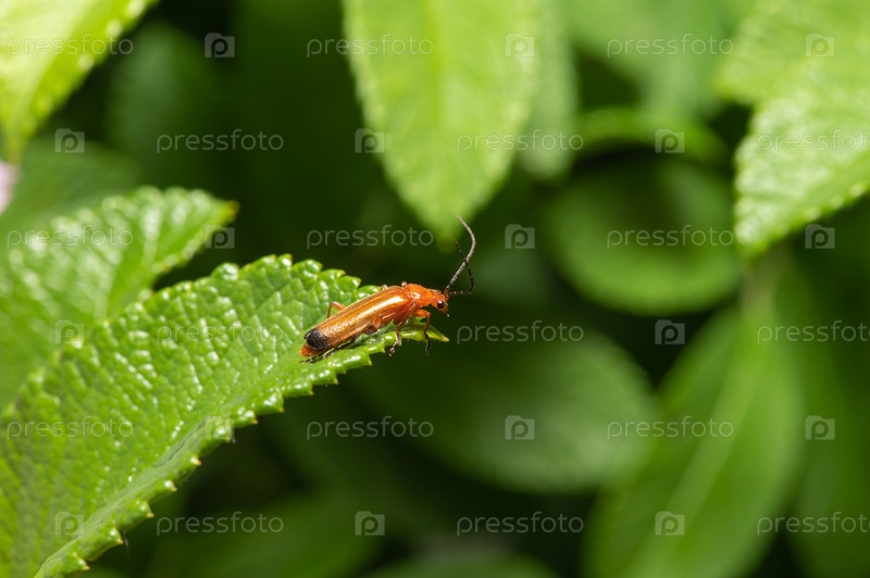 Красный жук с длинными черными усами