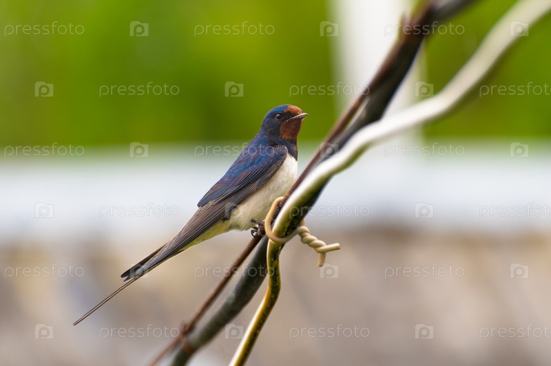 Ласточка сидит на проводах и смотрит одним глазом в сторону камеры