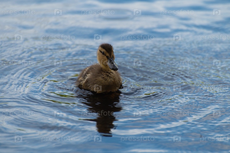 Маленький пушистый утенок плавает в пруду